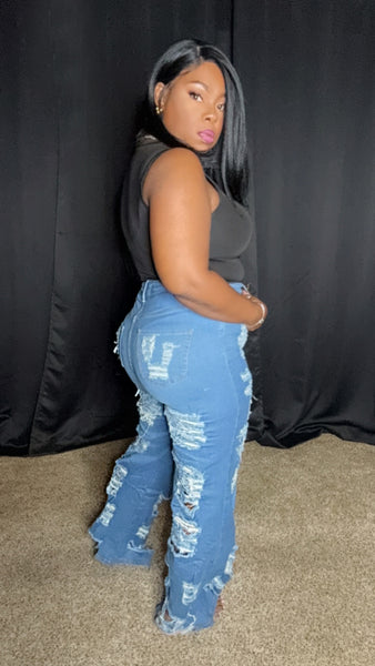 * High Rise Denim Wide Leg Flare Jeans w/ Front and Back Heavy Destruction