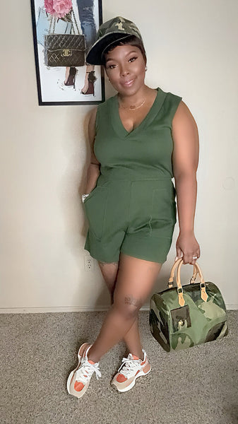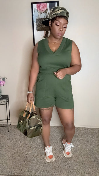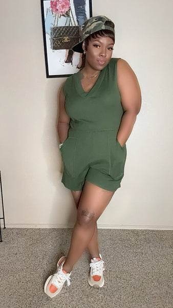 * COTTON SLEEVELESS ROMPER WITH POCKETS - ELASTIC WAIST - RIBBED V-NECK TOTAL BODY LENGTH: 17.5"(FRONT TOP), BUST: 38", INSEAM: 4" approx. - MEASURED FROM SMALL
