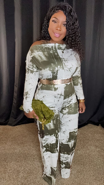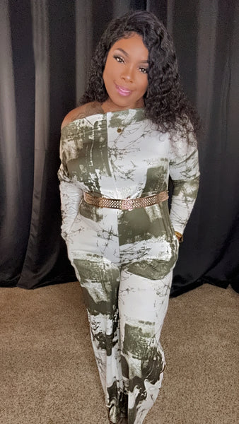 * -PRINTED OFF SHOULDER JUMPSUIT WITH SIDE POCKETS -RELAXED FIT