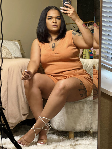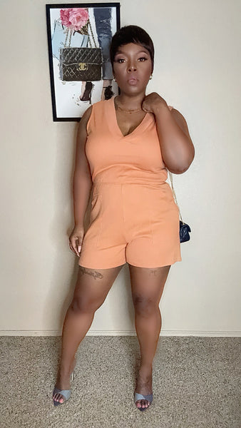 * COTTON SLEEVELESS ROMPER WITH POCKETS - ELASTIC WAIST - RIBBED V-NECK TOTAL BODY LENGTH: 17.5"(FRONT TOP), BUST: 38", INSEAM: 4" approx. - MEASURED FROM SMALL