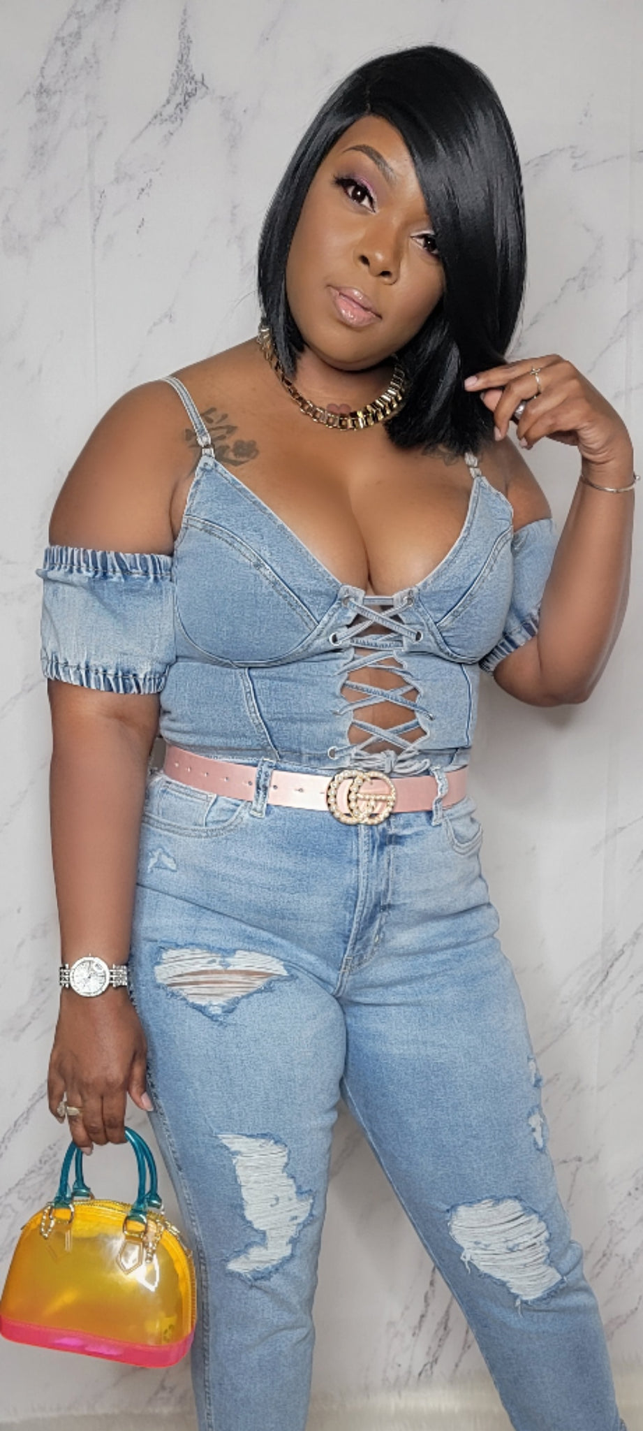 * Denim top with criss cross front detail * Fabric Content: * Model Wearing: Large **************** * COLOR MAY VARY SLIGHTLY DUE TO MONITOR RESOLUTION